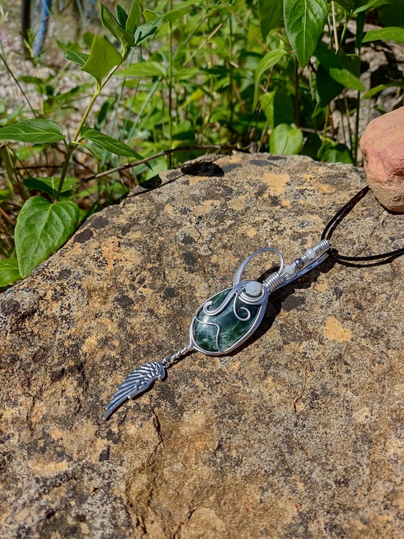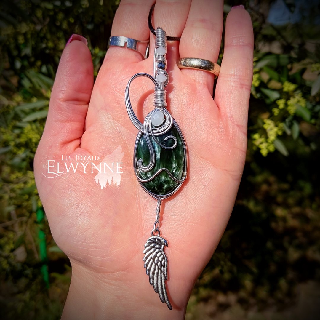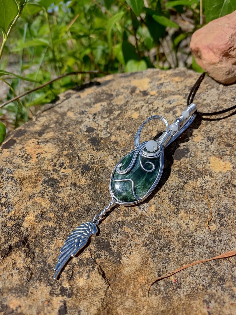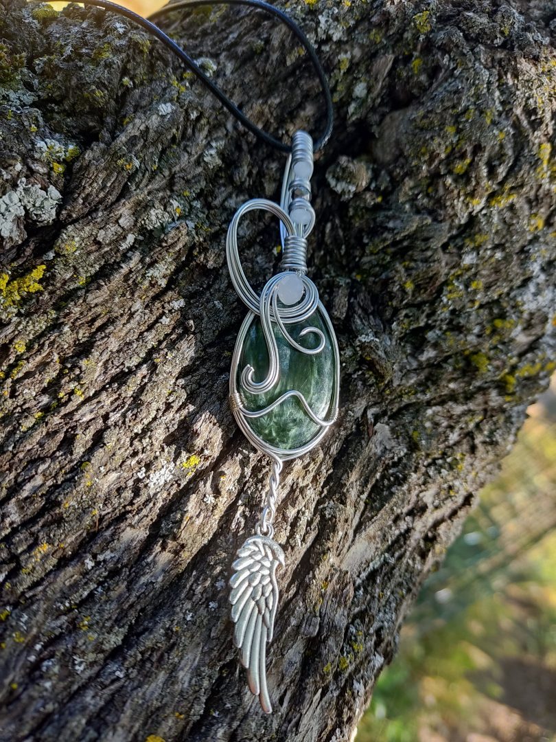 La séraphinite serait un minéral vert incroyable symbole d'harmonie des énergies et de bien-être profond. Elle aurait le pouvoir de capter les émotions négatives et traumatismes ancrés au plus profond de notre subconscient et de nous en libérer. Liée au chakra du cœur, la pierre séraphinite aiderait son porteur à sortir de sa zone de confort et faciliterait le contact avec autrui. Ce serait donc un très bon allié pour les personnes introverties qui auraient du mal à tisser des relations ou qui auraient du mal à gérer les situations conflictuelles. On prêterait à la séraphinite un pouvoir similaire à celui de l'améthyste qui aiderait à se libérer de certaines addictions. Les deux pierres pourraient être très complémentaires dans ce but. Aussi appelée pierre des anges, elle serait recommandée aux personnes qui pratiquent le voyage astral. La pierre apporterait vitalité, force de caractère et aiderait à surpasser les situations difficiles de la vie comme une séparation amoureuse.