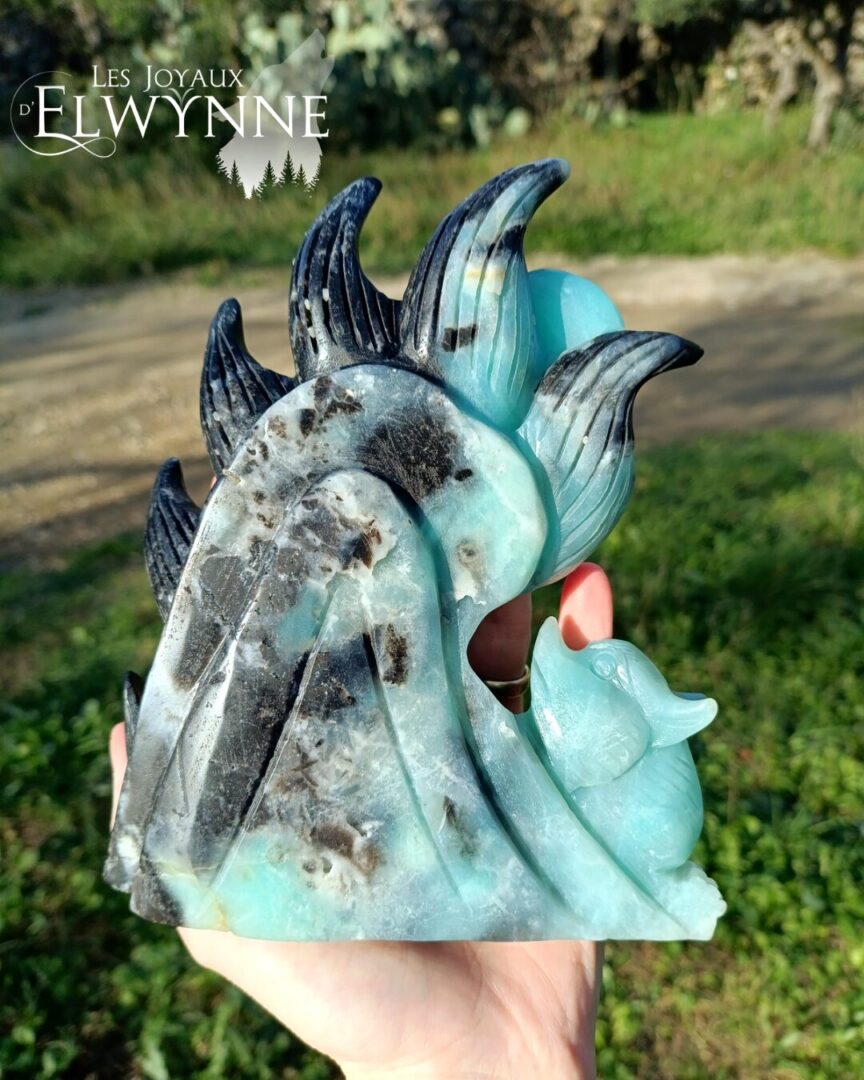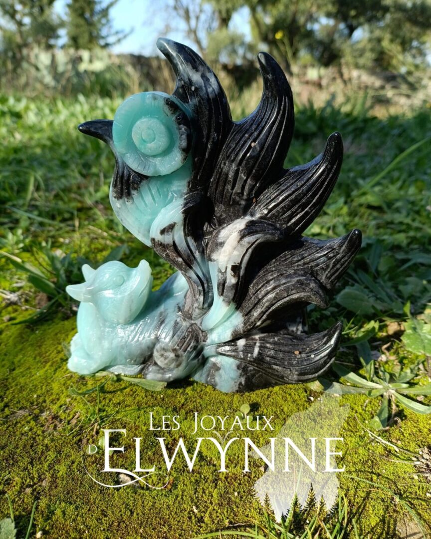 Ce kitsune est en Calcite des Caraïbes, la calcite des Caraïbes ou aragonite bleue contribue à la guérison des blessures émotionnelles passées ou présentes. Elle à une influence stabilisatrice, de sorte que nous ne sommes pas écrasés par notre réceptivité émotionnelle et notre empathie pour les autres. Elle apporte la patience, l’acceptation, la flexibilité, la tolérance. l'aragonite bleue aide à calmer et à apaiser son corps émotionnel. C'est une pierre particulièrement efficace pour adoucir les transitions émotionnelles provenant d'événements traumatisants auxquels nous refusons de faire face, de pleurer la perte de quelqu'un et de ne pas être en mesure de faire face au chagrin, ainsi que d'avoir simplement du mal à surmonter une récente rupture dans une relation sérieuse.