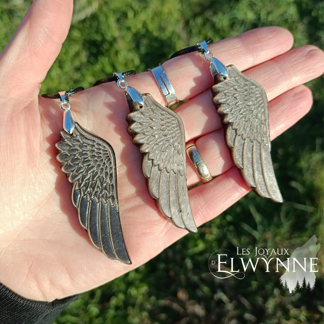 Pendentif aile d’ange en Obsidienne argentée