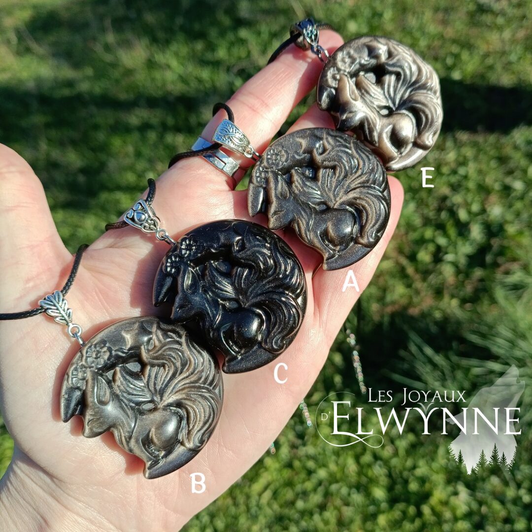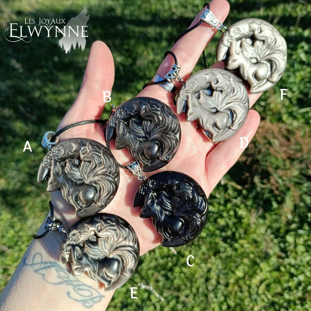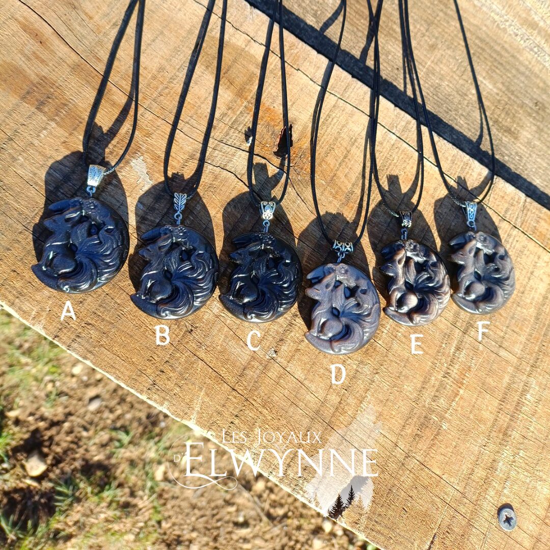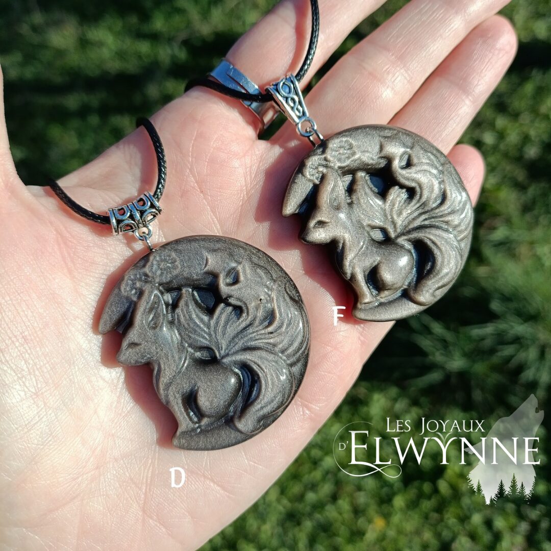 🦊 Pendentif Kitsune en Obsidienne argentée