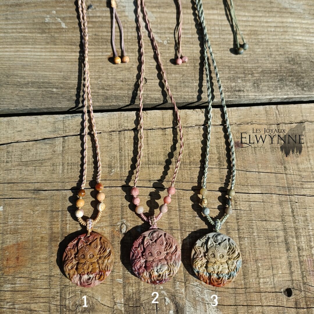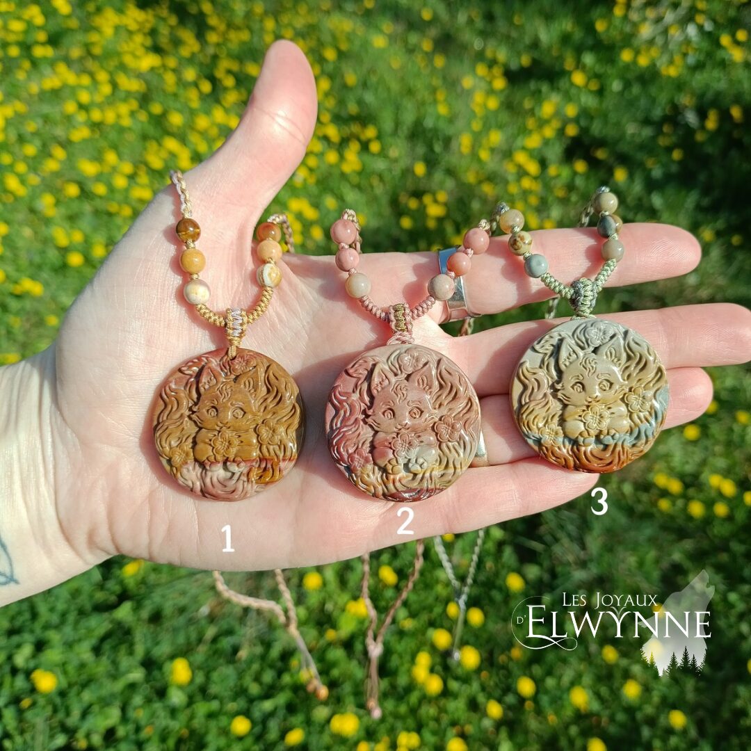 Pendentif Kitsune (Renard) 🦊 en Agate Alashan, accompagné de ces perles également en Agate Alashan, cordon réglable.