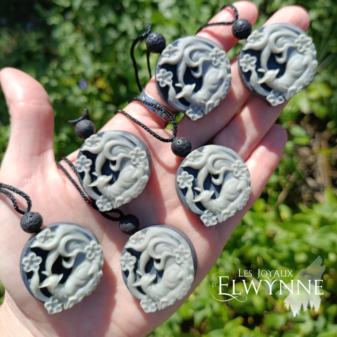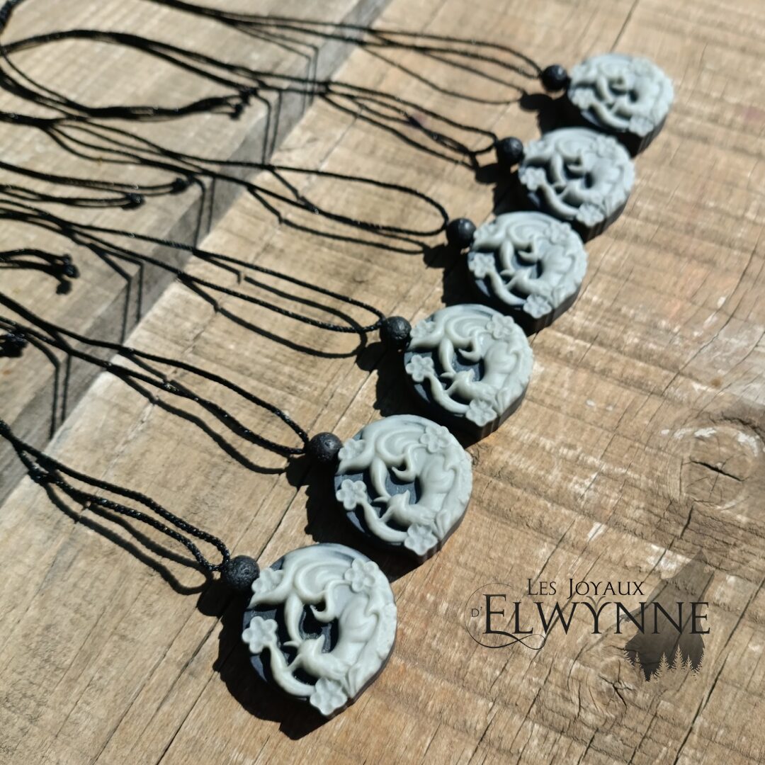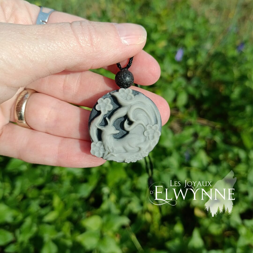 Pendentif Cerf Mystique en Jaspe Tai Chi et sa perle en Pierre de Lave