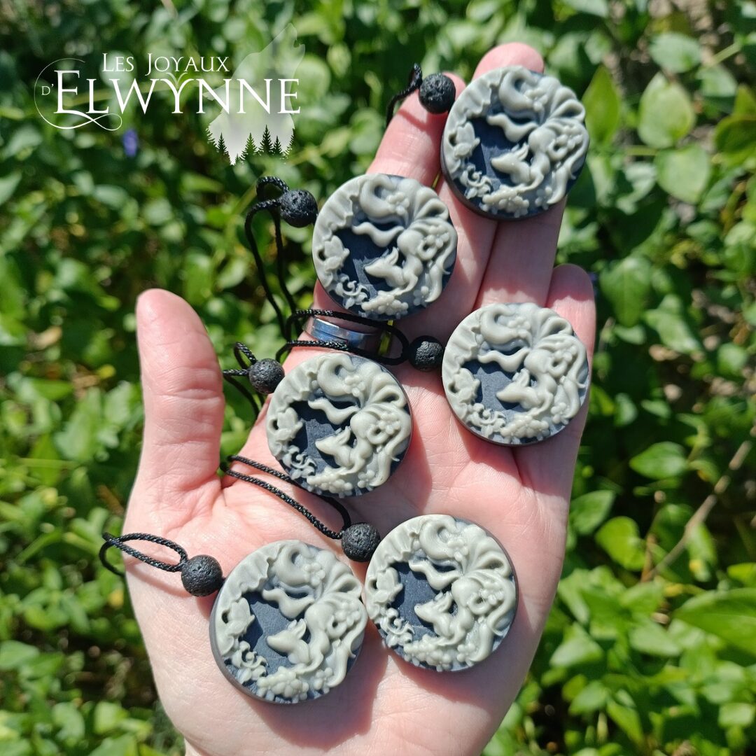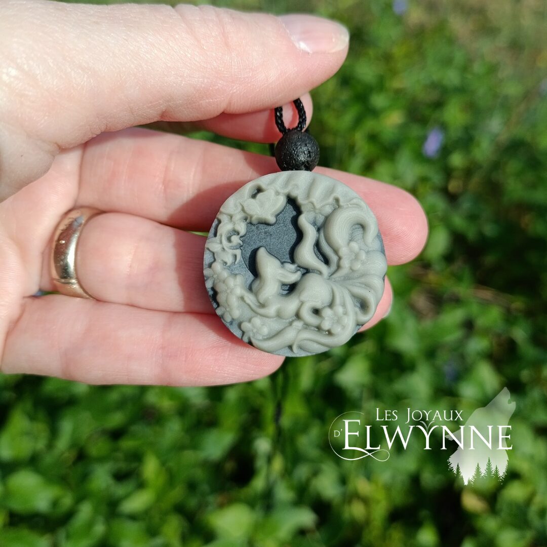 Pendentif Cerf Mystique en Jaspe Tai Chi et sa perle en Pierre de Lave