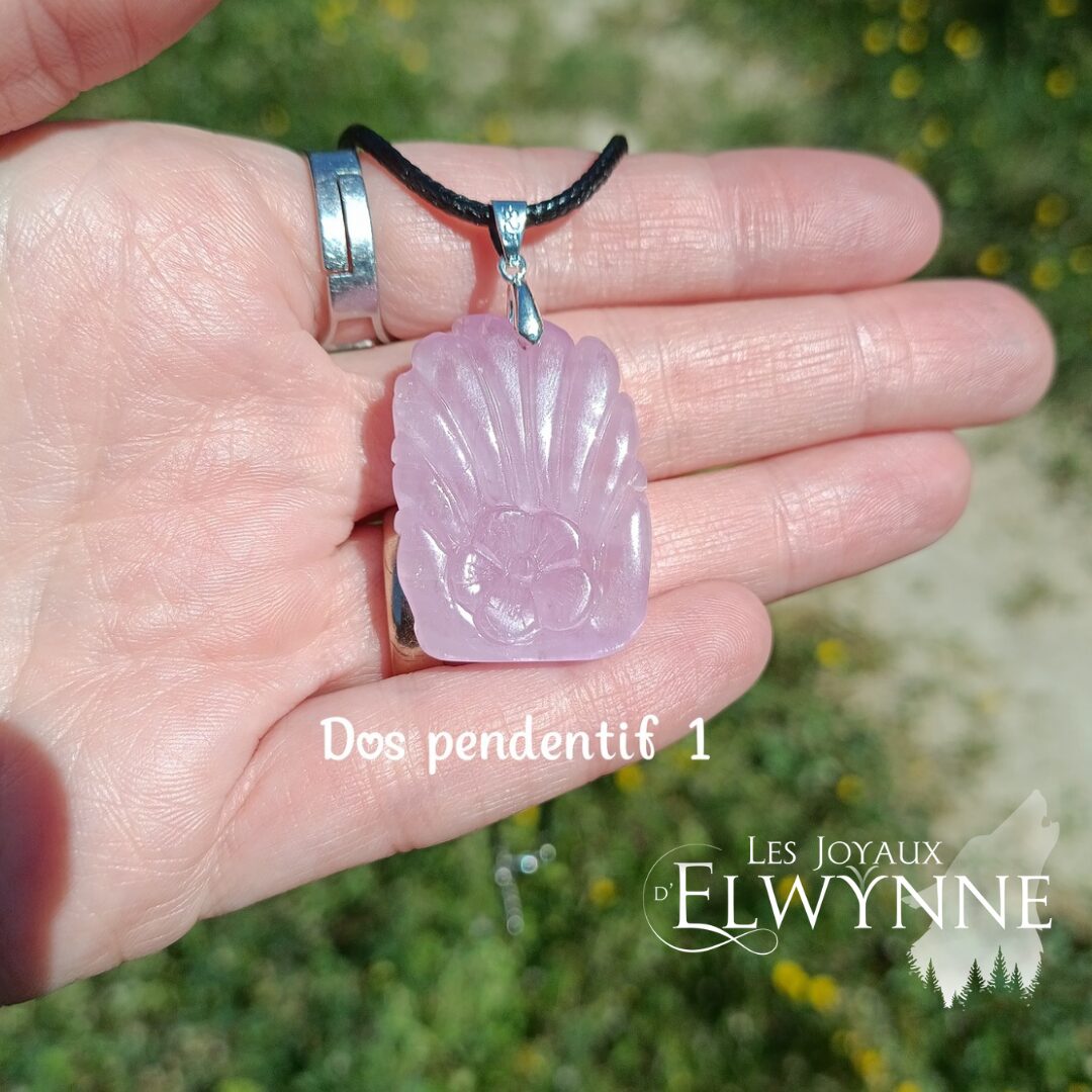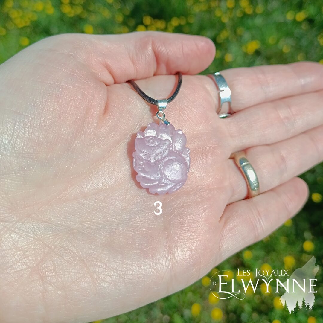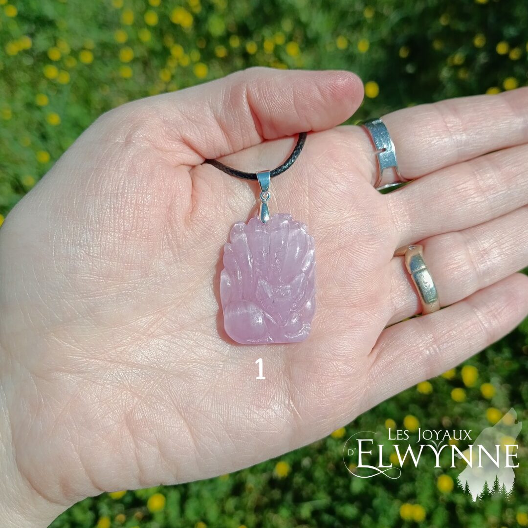 Magnifique pendentif Kitsune (Renard) đŠ en Kunzite, avec bĂ©liĂšre en argent 925 et cordon noir cirĂ©.