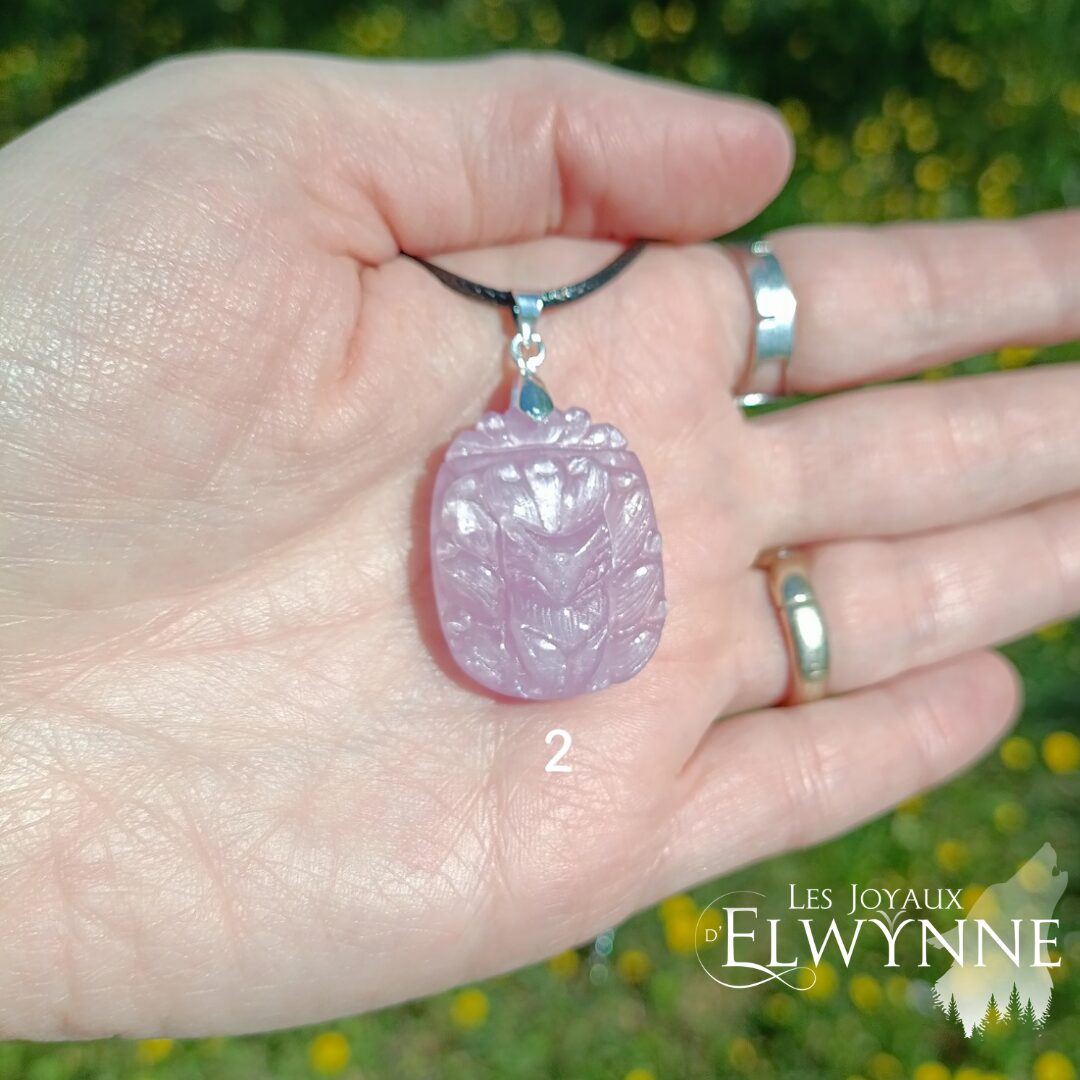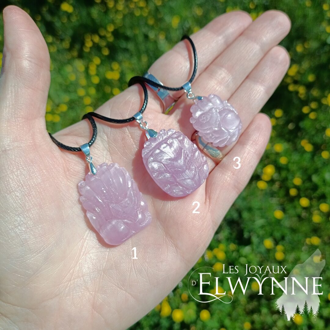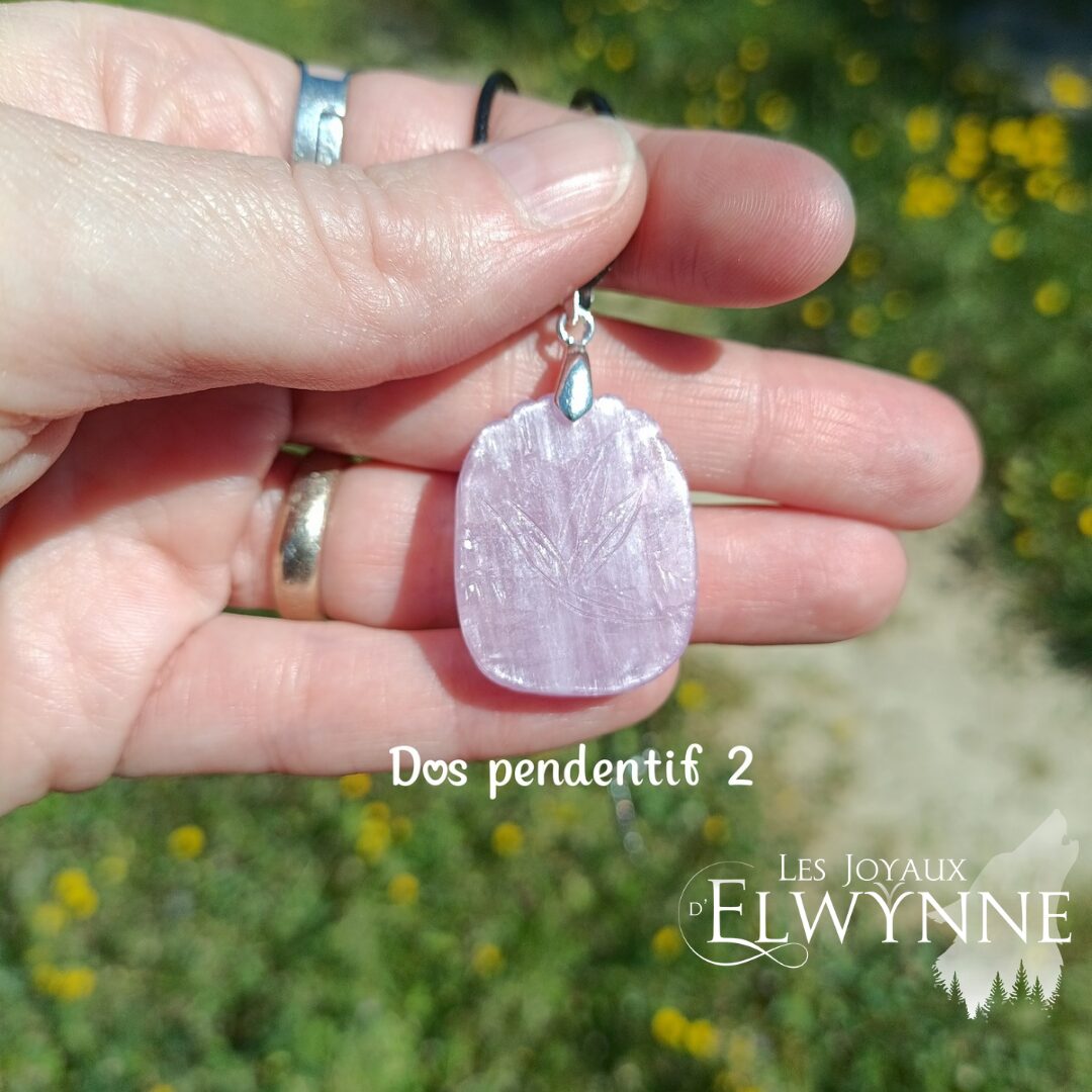 Magnifique pendentif Kitsune (Renard) đŠ en Kunzite, avec bĂ©liĂšre en argent 925 et cordon noir cirĂ©.