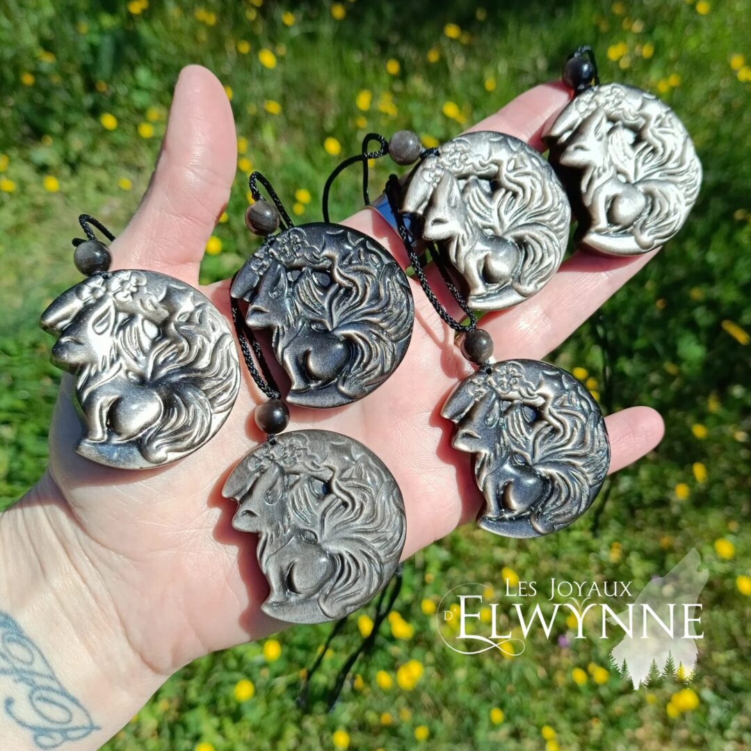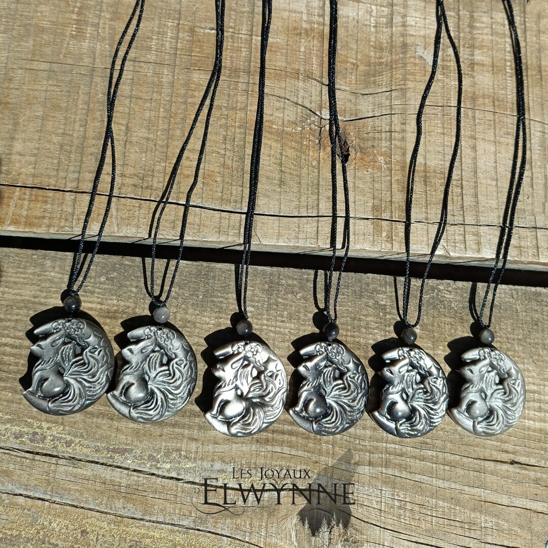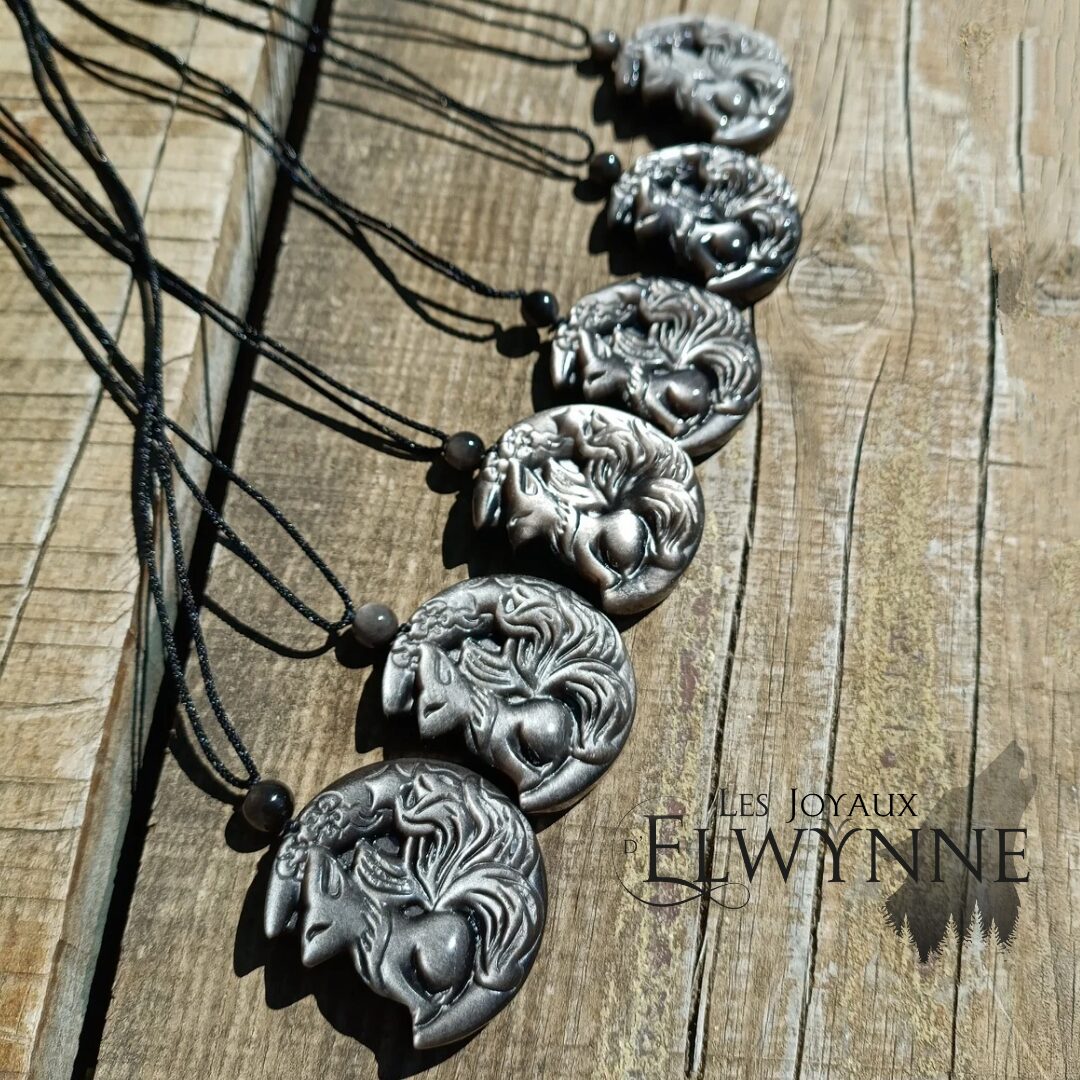 Pendentif Kitsune (Renard) en Obsidienne argentée ✨ avec une perle en Obsidienne dorée et un cordon noir réglable.