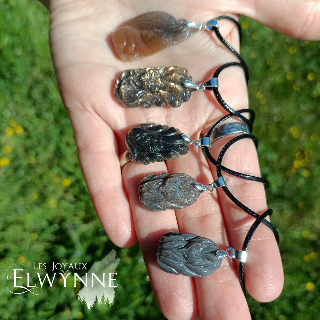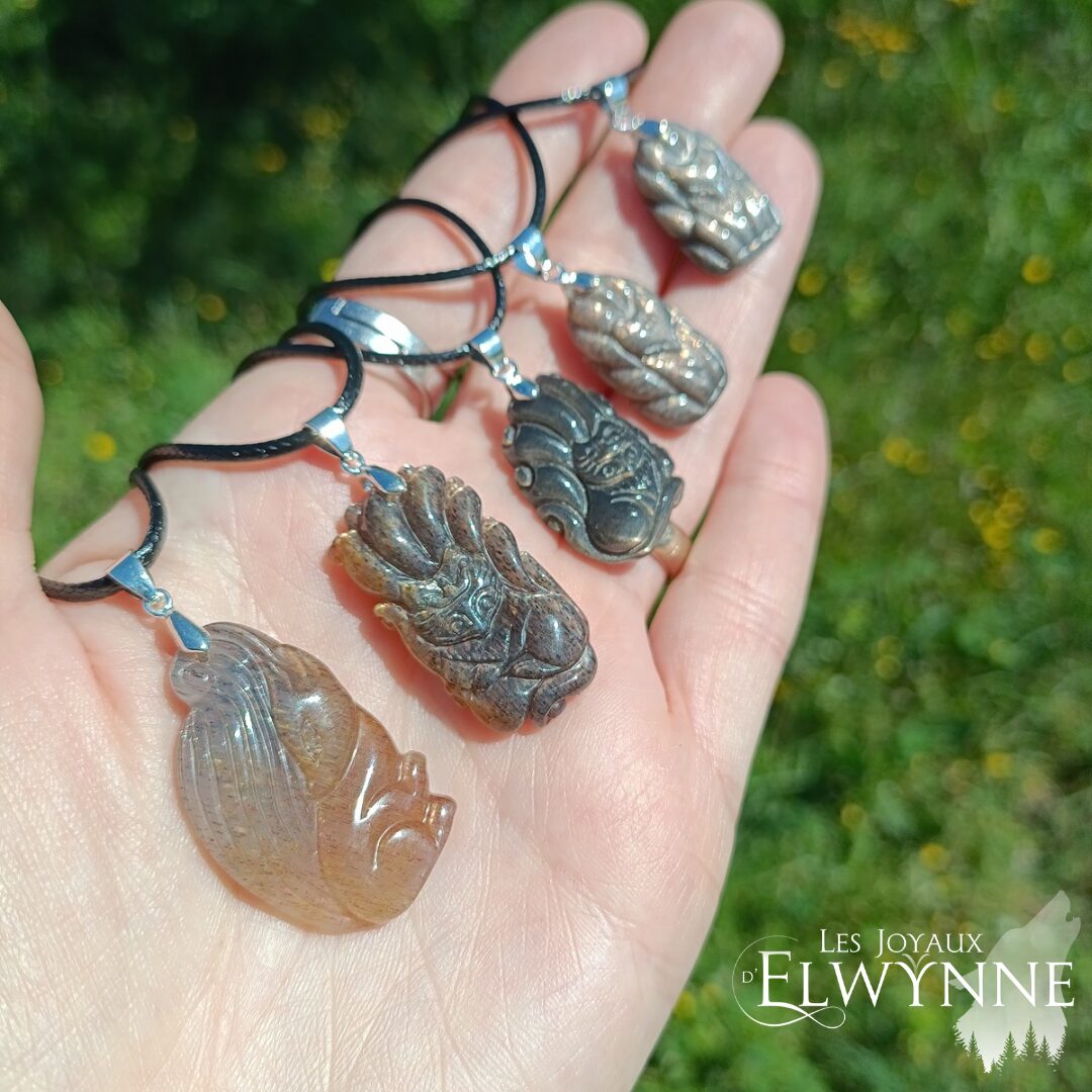 Magnifique pendentif Kitsune (Renard) đŠ en Pierre de Lune noire đ€ avec bĂ©liĂšre en argent 925 et cordon cirĂ© noir.