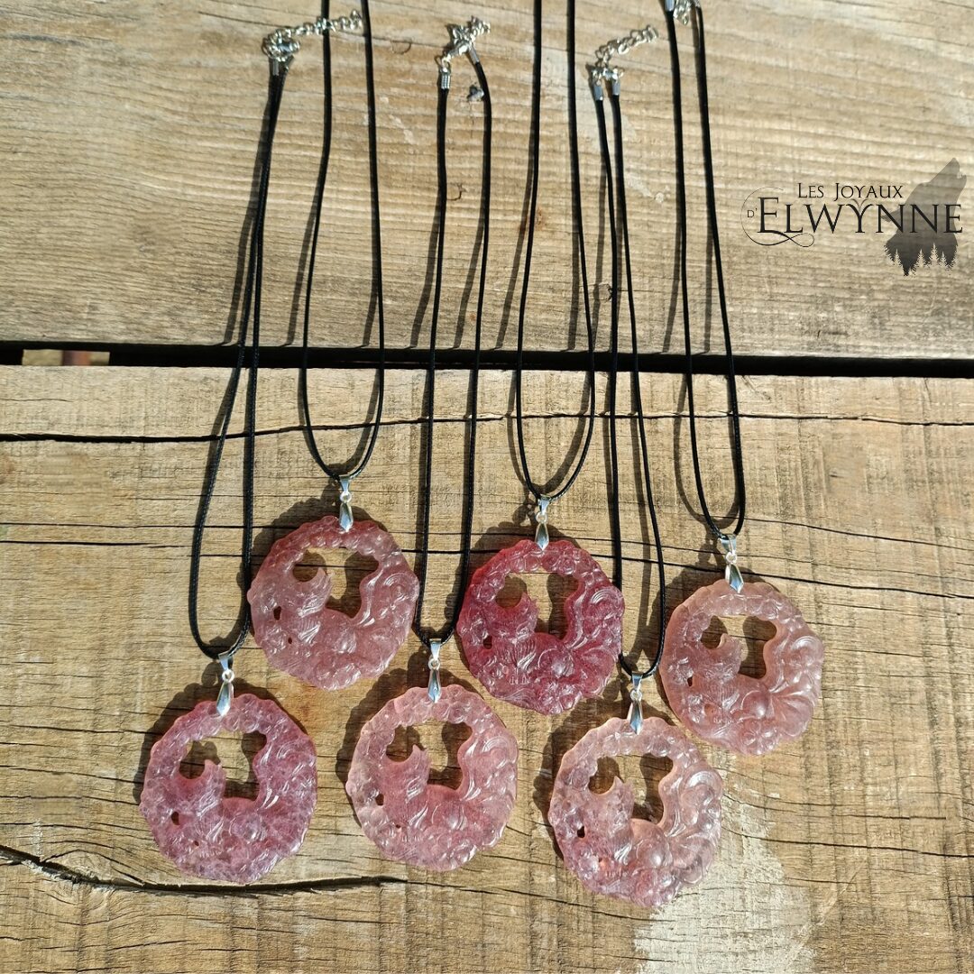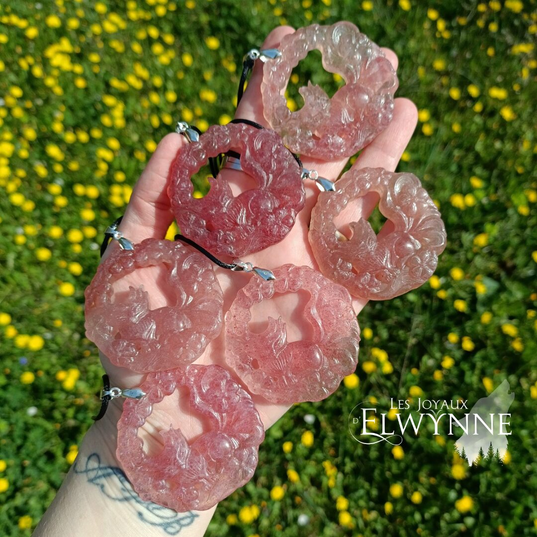 Pendentif Kitsune (Renard) 🦊 en Quartz Fraise 🍓, bélière en argent 925 et cordon noir ciré.