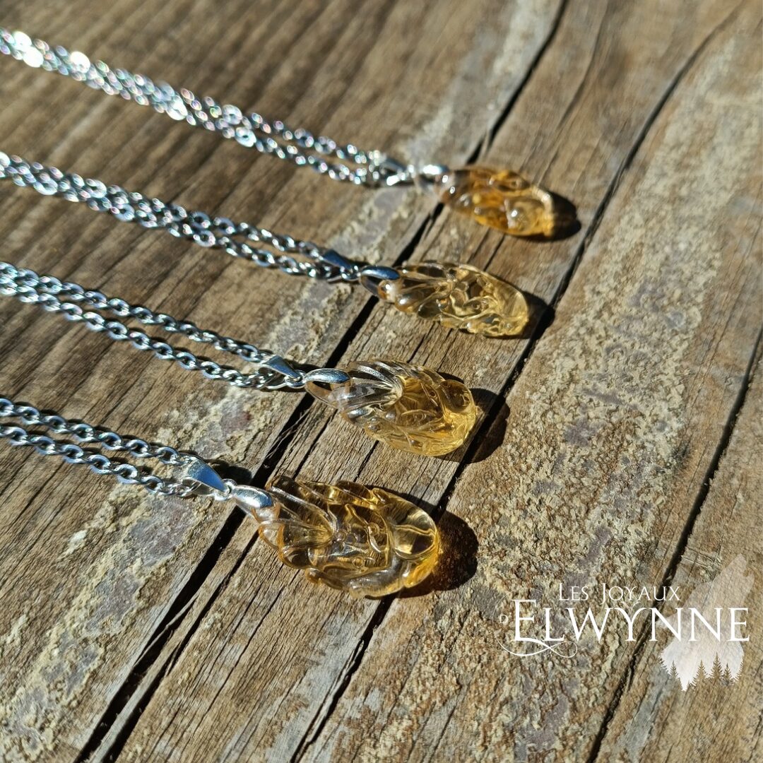 Magnifique pendentif renard (Kitsune) en citrine, bélière en argent 925 et son cordon noir ciré.