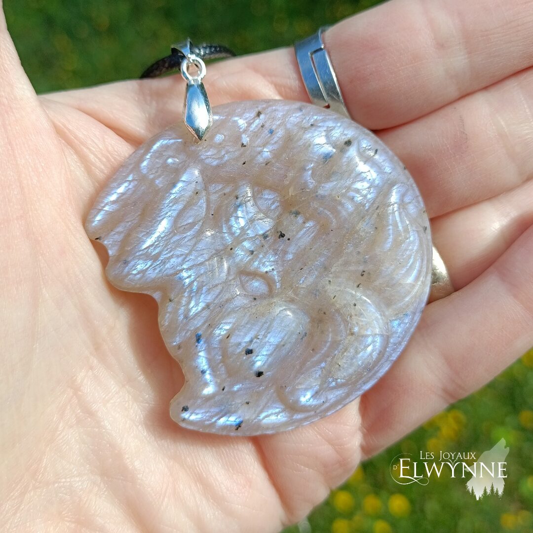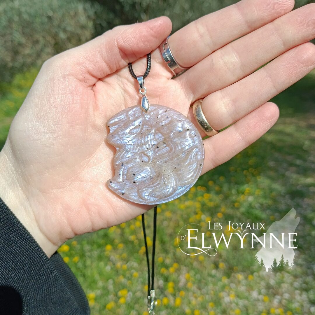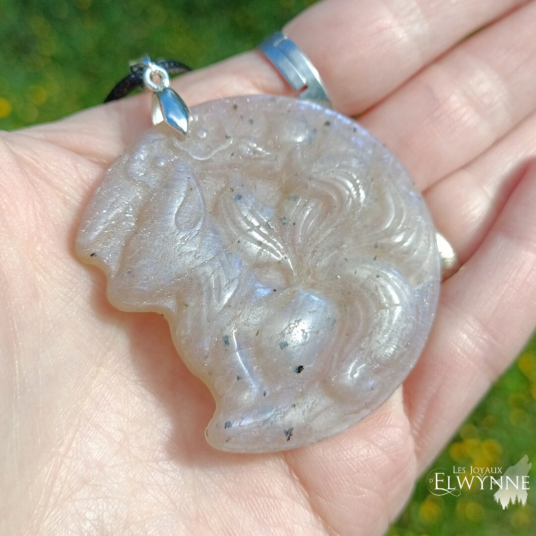 Magnifique pendentif Renard (Kitsune) en Pierre de Lune et Pierre du Soleil ☀️ bélière argent 925 et un cordon noir ciré.