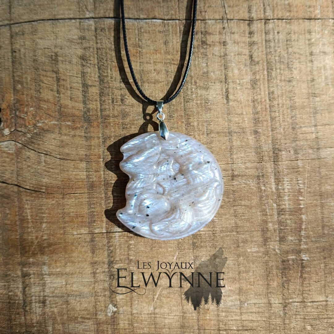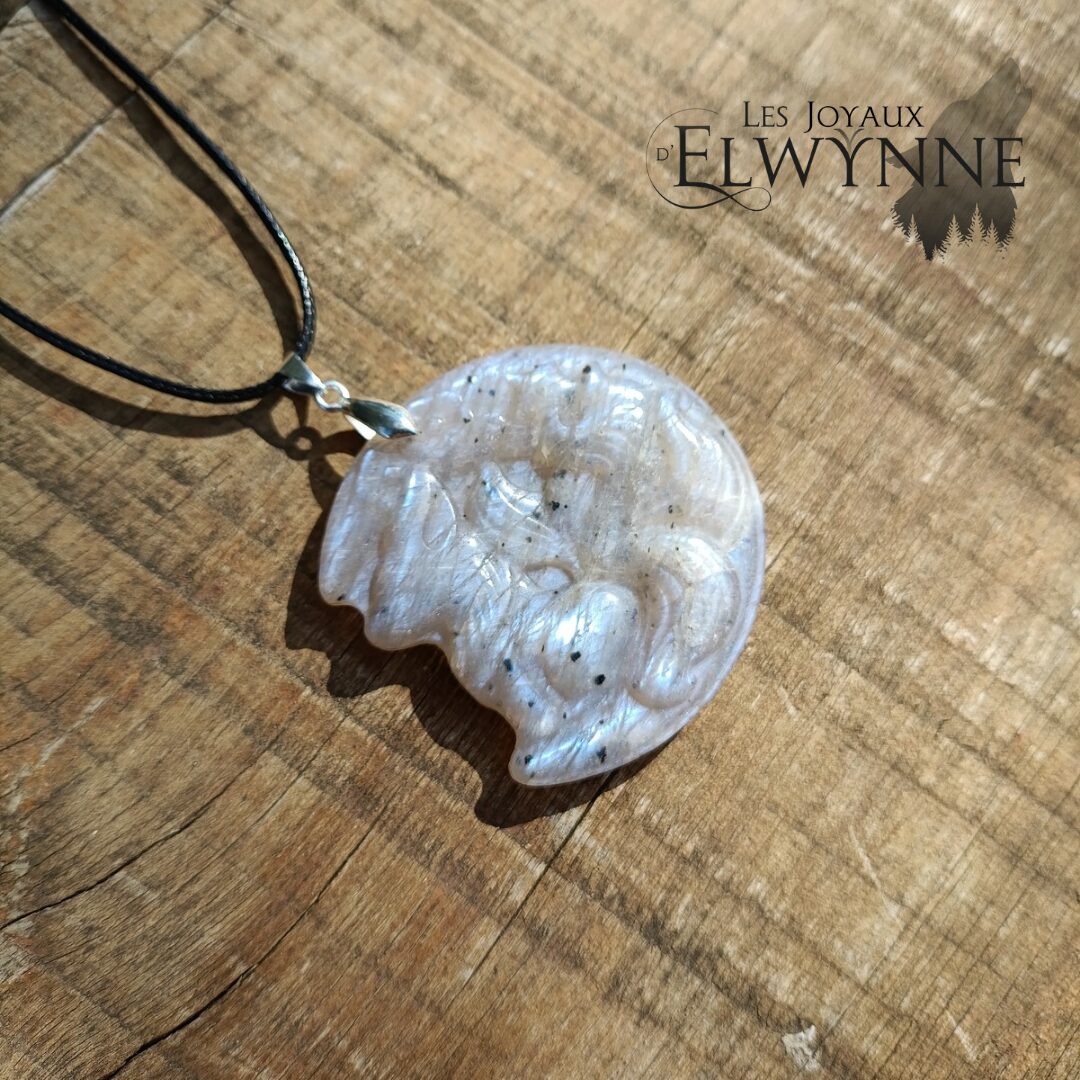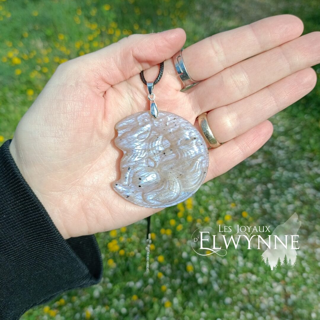 Magnifique pendentif Renard (Kitsune) en Pierre de Lune et Pierre du Soleil ☀️ bélière argent 925 et un cordon noir ciré.